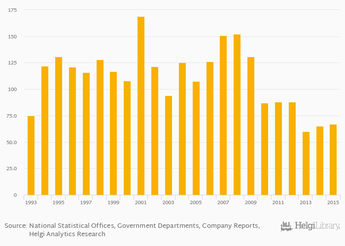 Slovakia has been ranked 63rd within the group of 84 countries we follow in terms of gypsum and plaster production, 9 places below the position seen 10 years ago.