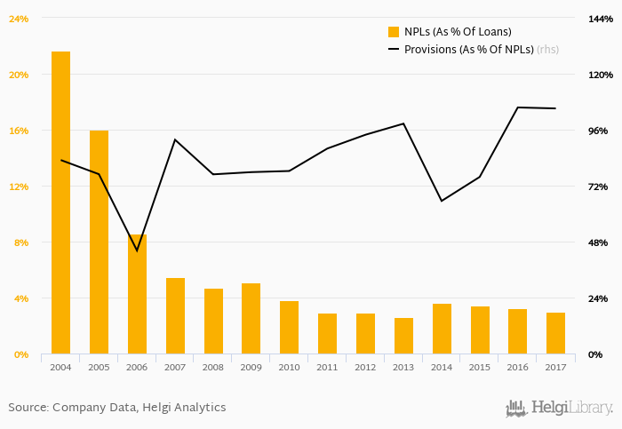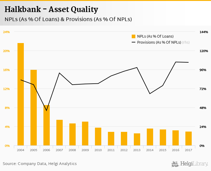Halkbank's non-performing loans reached 2.97% of total loans at the end of 2017, down from 3.23% compared to the previous year. Historically, the NPL ratio hit an all time high of 21.6% in 2004 and an all time low of 2.60% in 2013.