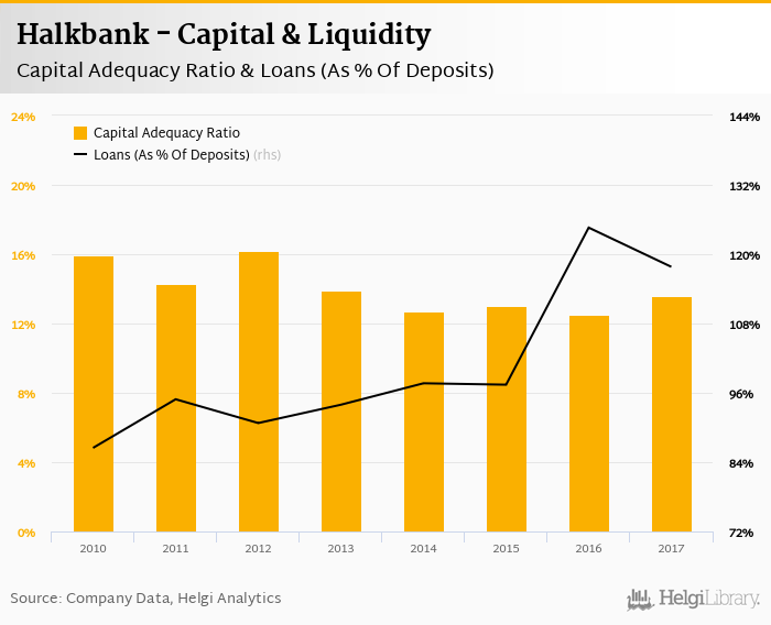 Halkbank's capital adequacy ratio reached 13.6% at the end of 2017, up from 12.5% compared to the previous year. Historically, the bank’s capital ratio hit an all time high of 16.2% in 2012 and an all time low of 12.5% in 2016.