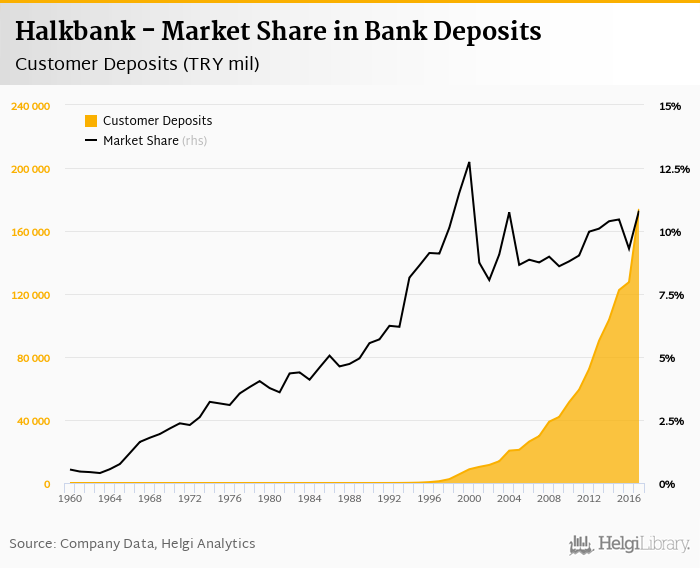 Halkbank accounted for 10.8% of all customer deposits taken by banks in Turkey at the end of 2017. Historically, the bank’s market share in customer deposits reached an all time high of 12.7% in 2000 and an all time low of 0.395% in 1963.