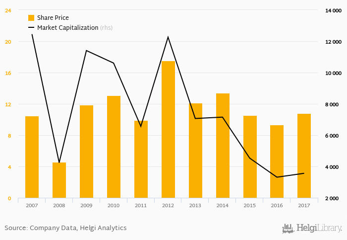 Since the end of 2012, the stock has depreciated by -38.4 % implying an annual average growth of -9.24 %. In absolute terms, the value of the company fell by USD -8,699 mil.