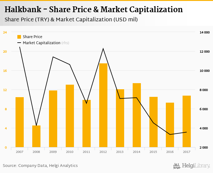 Halkbank stock traded at TRY 10.8 per share at the end of 2017 implying a market capitalization of USD 3,562 mil.