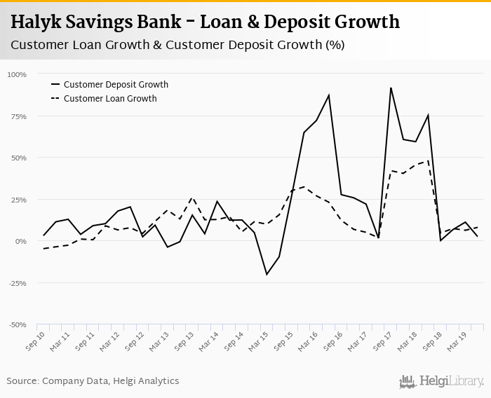 Halyk Savings Bank's customer loan growth reached 7.80% in 2019-06-30, down from 47.6% compared to the previous year. Historically, the bank’s loans growth reached an all time high of 47.6% in 2018-06-30 and an all time low of -5.00% in 2010-09-30. In the last decade, the average annual loan growth amounted to 0%.