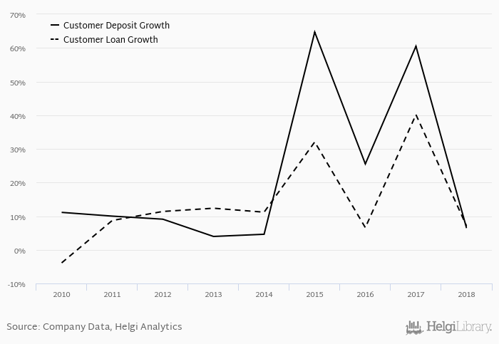 On the other hand, bank's customer deposit growth amounted to 6.44% at the end of 2018, down from 60.5% when compared to the previous year. Historically, the bank’s deposit growth reached an all time high of 64.7% in 2015 and an all time low of 3.97% in 2013. In the last decade, the average annual loan growth amounted to 0%.
