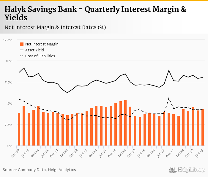 Halyk Savings Bank's net interest margin amounted to 4.36% in the second quarter of 2019, up from 4.16% when compared to the previous quarter.
