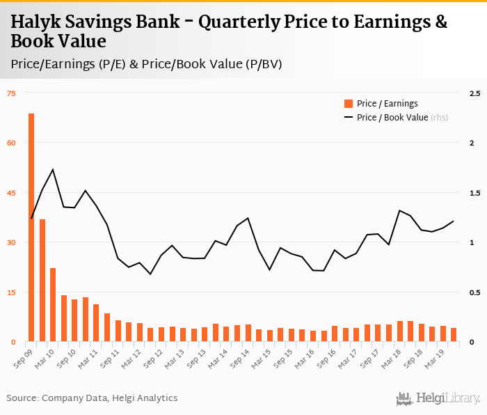 Halyk Savings Bank stock traded at RUB 117 per share at the end second quarter of 2019 implying a market capitalization of USD 21,612 mil.