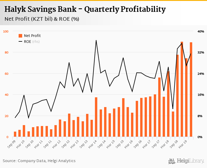 Halyk Savings Bank made a net profit of KZT 89.7 bil in the second quarter of 2019, up 272% when compared to the same period of last year. This implies a return on equity of 31.5%.