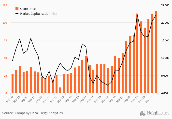 Over the last five years, the stock has appreciated by 150 % implying an annual average growth of 20.2 %. In absolute terms, the value of the company rose by USD 6,495 mil.