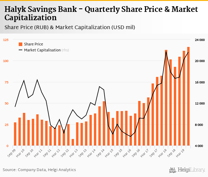 Halyk Savings Bank stock traded at RUB 117 per share at the end of second quarter of 2019 implying a market capitalization of USD 21,612 mil.
