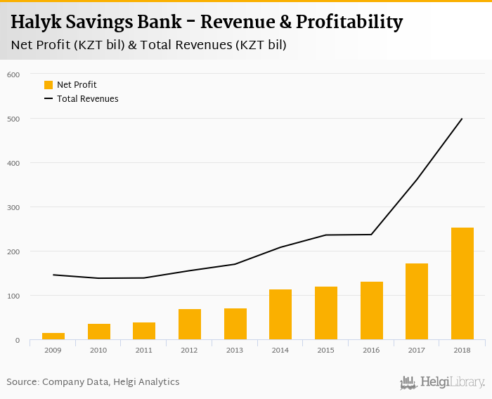 Halyk Savings Bank made a net profit of KZT 253 bil under revenues of KZT 499 bil in 2018, up 46.1% and 38.4% respectively compared to the previous year.