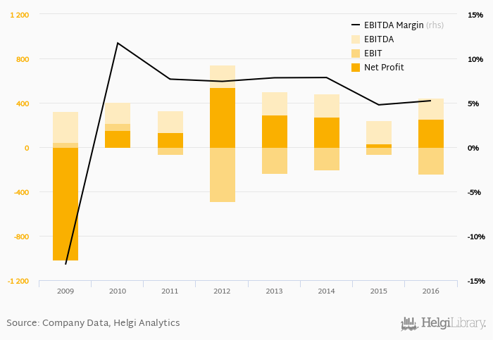 Historically, between 2009 - 2016, the firm’s net profit reached a high of CZK 540 mil in 2012 and a low of CZK -1,014 mil in 2009. Since 2011, the firm's net profit has increased 89% or 13.6% a year on average.