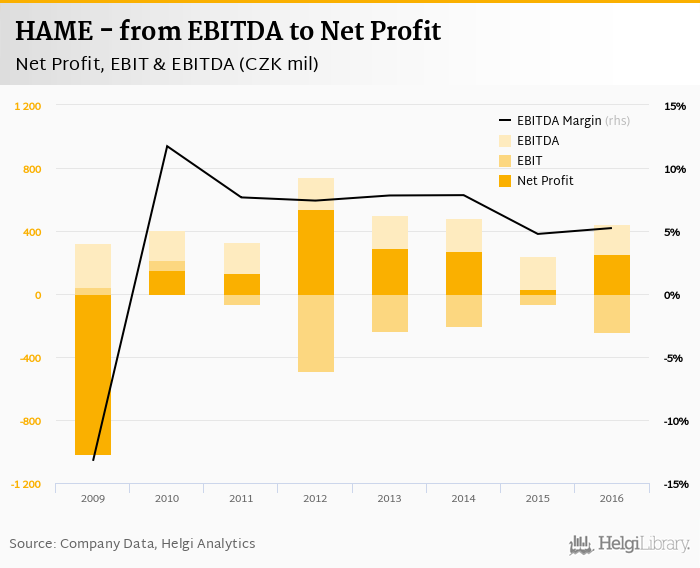 HAME made a net profit of CZK 252 mil with revenues of CZK 3,858 mil in 2016, up by 662% and up by 0.62%, respectively, compared to the previous year. This translates into a net margin of 6.54%.