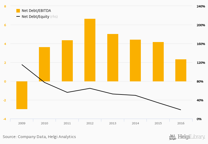 Historically, the firm’s net debt to equity reached a high of 115% in 2009 and a low of 18.8% in 2016 between 2009 and 2016. The average for the last five years was 43.9%.