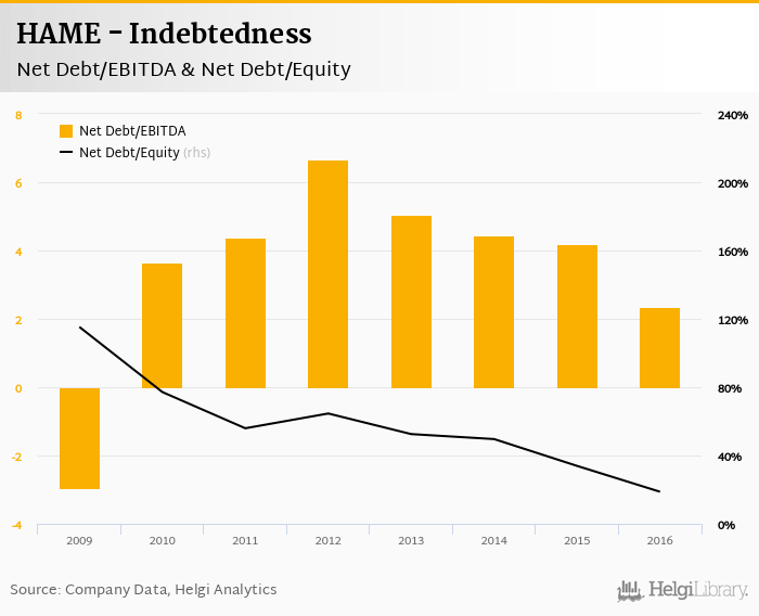 HAME's net debt stood at CZK 472 mil and accounted for 18.8% of equity at the end of 2016. The ratio is down 15.1 pp compared to the previous year.