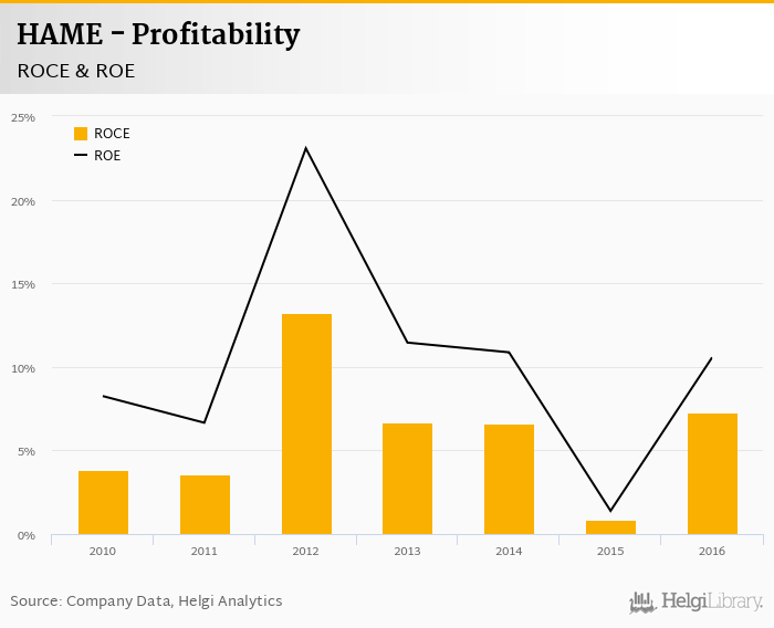 As far as HAME's peers are concerned, EMCO generated ROE of 22.1% and ROCE of 5.69% in 2016. Madeta's profitability reached 25.2% and 23.4%, respectively. Kostelecke Uzeniny operated with 26.0% and 6.09% returns in 2016.