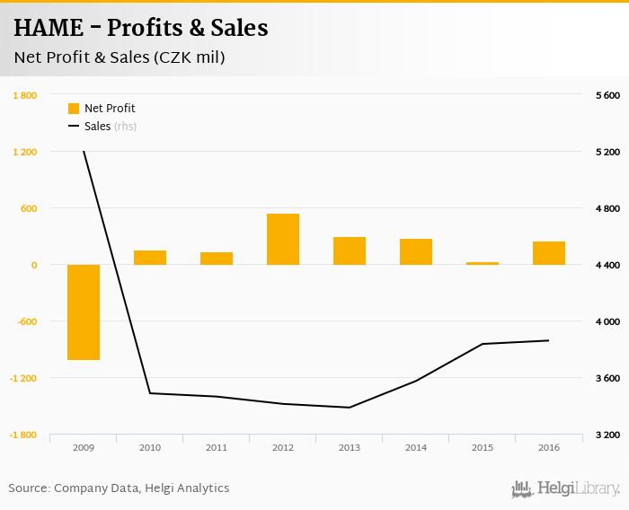 HAME made a net profit of CZK 252 mil in 2016, up 662% compared to the previous year. Total sales reached CZK 3,858 mil, which is up 0.62% when compared to the previous year.