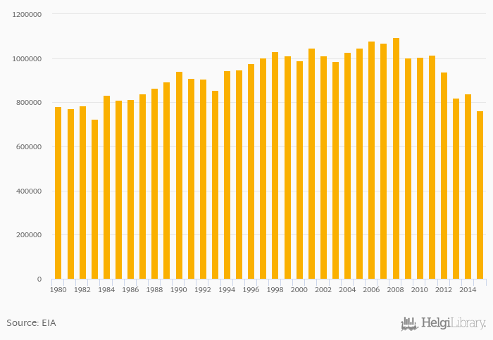Hard coal production fell 9.38% to 761,560 kt in the USA in 2015, according to the National Statistical Office.