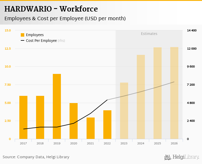 HARDWARIO employed 4.00 employees in 2022, up 33.3% compared to the previous year. Historically, between 2017 and 2022, the firm's workforce hit a high of 9.00 employees in 2019 and a low of 3.00 employees in 2021.