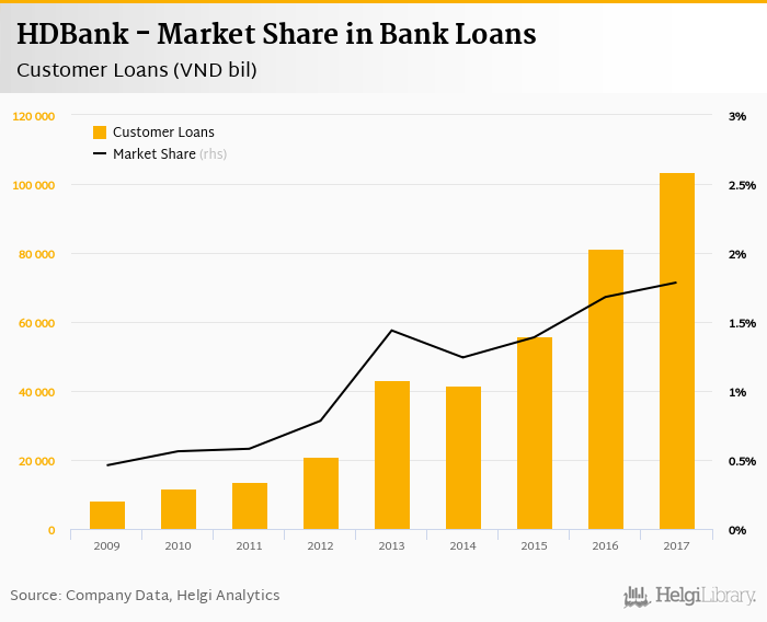 HDBank accounted for 1.79% of all customer loans issued in Vietnam at the end of 2017. Historically, the bank’s market share in customer loans reached an all time high of 1.79% in 2017 and an all time low of 0.461% in 2009.