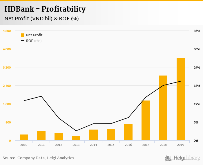 HDBank made a net profit of VND 3,605 bil in 2019, up 26.8% compared to the previous year. This implies a return on equity of 19.4%.