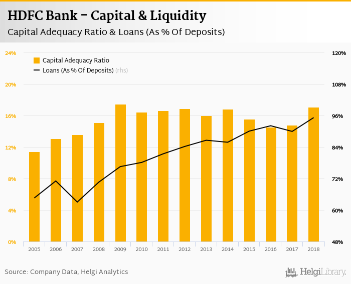 HDFC Bank's capital adequacy ratio reached 17.1% at the end of 2018, up from 14.8% compared to the previous year. Historically, the bank’s capital ratio hit an all time high of 17.5% in 2009 and an all time low of 11.4% in 2005.