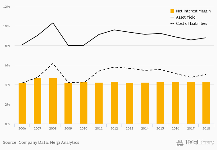 Historically, the bank’s net interest margin reached an all time high of 4.68% in 2008 and an all time low of 4.15% in 2009. The average margin in the last five years amounted to 4.26%.
