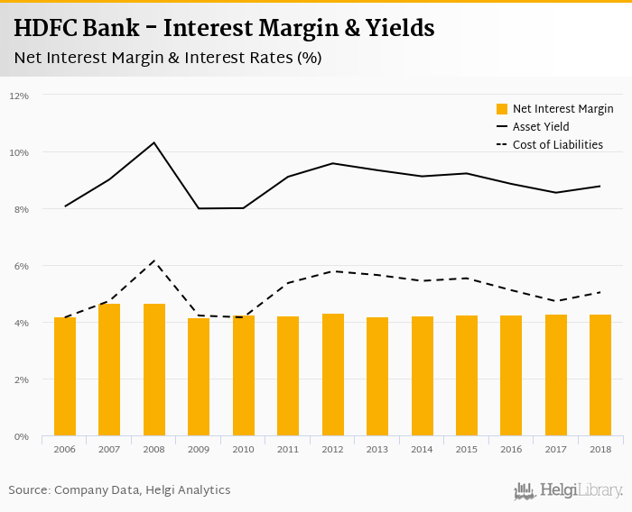 HDFC Bank's net interest margin amounted to 4.29% in 2018, down from 4.30% compared to the previous year.