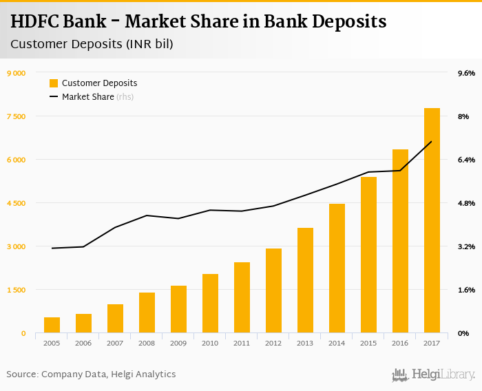 HDFC Bank accounted for 7.06% of all customer deposits taken by banks in India at the end of 2017. Historically, the bank’s market share in customer deposits reached an all time high of 7.06% in 2017 and an all time low of 3.11% in 2005.