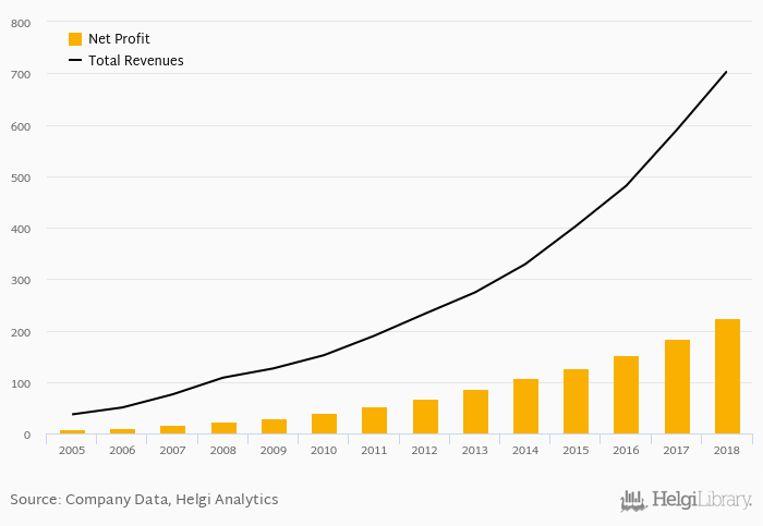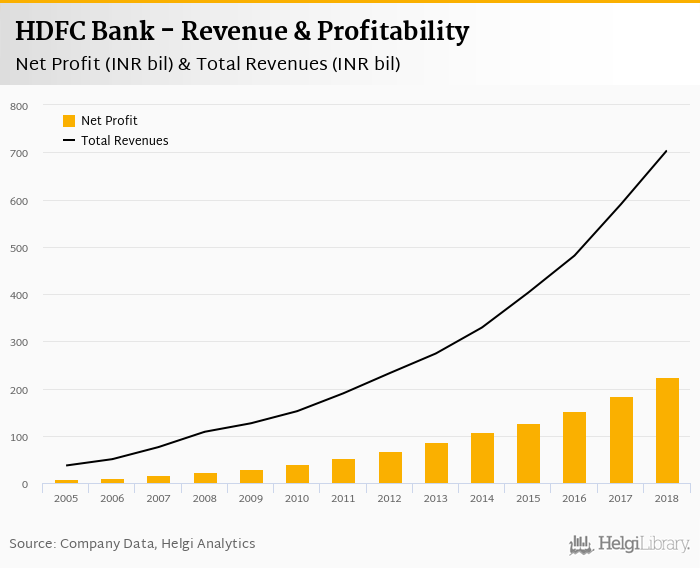 HDFC Bank made a net profit of INR 223 bil under revenues of INR 704 bil in 2018, up 20.7% and 19.4% respectively compared to the previous year.