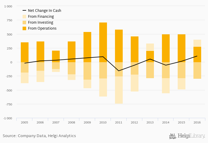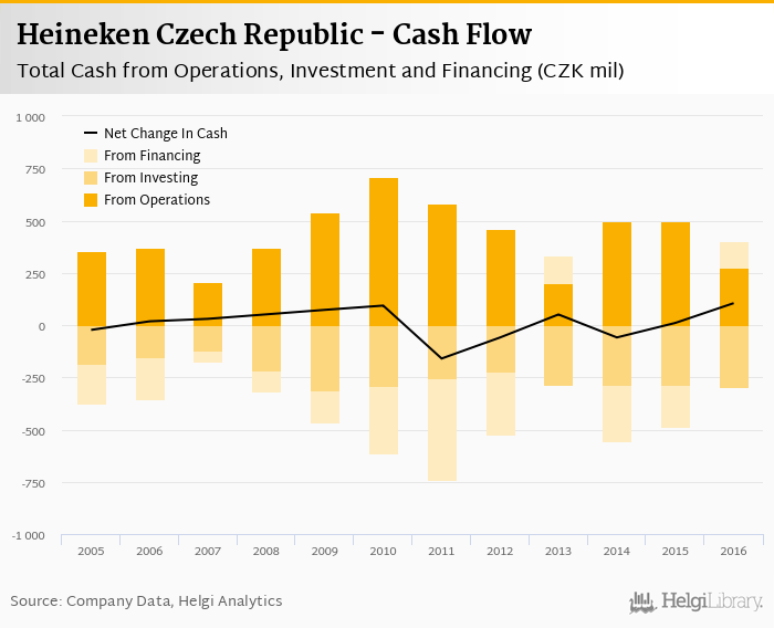 Cash from financing amounted to CZK 127 mil, so the company generated CZK 105 mil net cash in 2016.