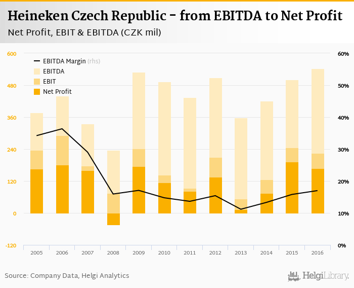 As far as Heineken Czech Republic's peers are concerned, Plzensky Prazdroj posted net and EBITDA margin of 26.0% and 44.5%, respectively in 2016, Budejovicky Budvar generated margins of 10.1% and 22.3% and Pivovar Svijany profit margin reached 21.5% on the net and 20.7% on the EBITDA level in 2019.