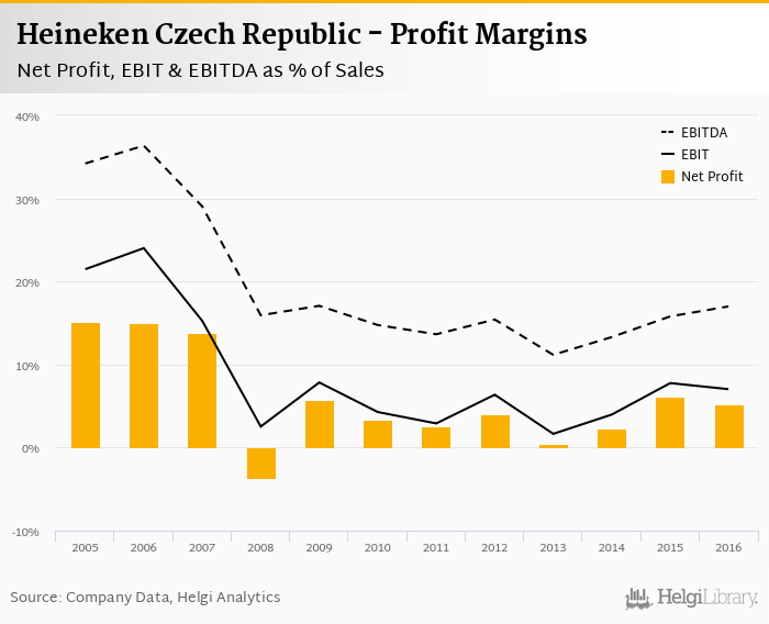 Heineken Czech Republic made a net profit of CZK 168 mil with revenues of CZK 3,194 mil in 2016, down by 13% and up by 0.777%, respectively, compared to the previous year.