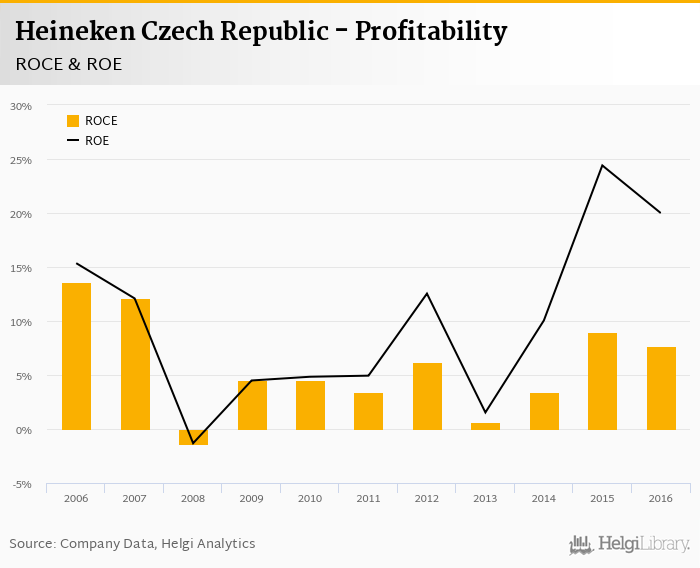 As far as Heineken Czech Republic's peers are concerned, Plzensky Prazdroj generated ROE of 71.3% and ROCE of 31.4% in 2016. Budejovicky Budvar's profitability reached 6.05% and 10.6%, respectively. Pivovar Svijany operated with 30.5% and 29.2% returns in 2016.
