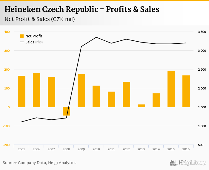 As far as Heineken Czech Republic's peers are concerned, Plzensky Prazdroj posted a net profit and sales of CZK 3,867 mil and CZK 14,890 mil in 2016, Budejovicky Budvar generated a net profit of CZK 264 mil (with sales of CZK 2,612 mil), and Pivovar Svijany netted USD CZK 236 mil (sales of CZK 1,100 mil).