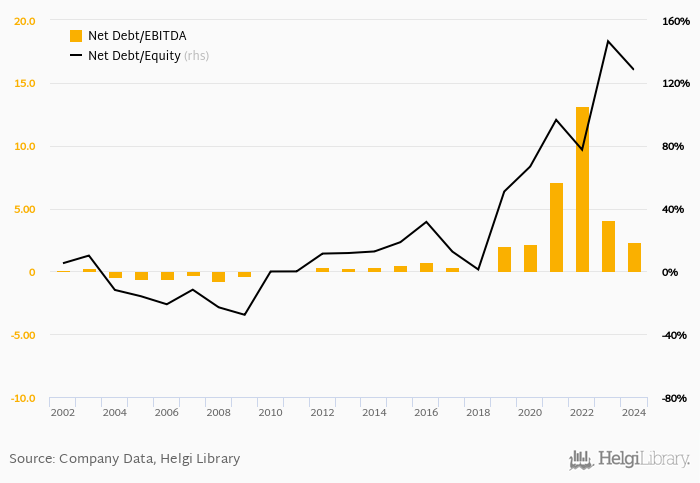 Historically, the firm’s net debt to equity reached a high of 146% in 2023 and a low of -27.7% in 2009 between 2002 and 2024. The average for the last five years was 103%.