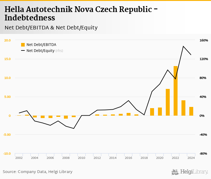 Hella Autotechnik Nova Czech Republic's net debt stood at CZK 3,665 mil and accounted for 128% of equity at the end of 2024. The ratio is down 18.2 pp compared to the previous year.