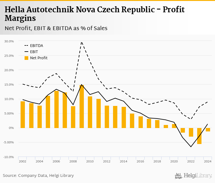 Hella Autotechnik Nova Czech Republic made a net profit of CZK -216 mil with revenues of CZK 17,522 mil in 2024, up by 74.9% and up by 13.6%, respectively, compared to the previous year.