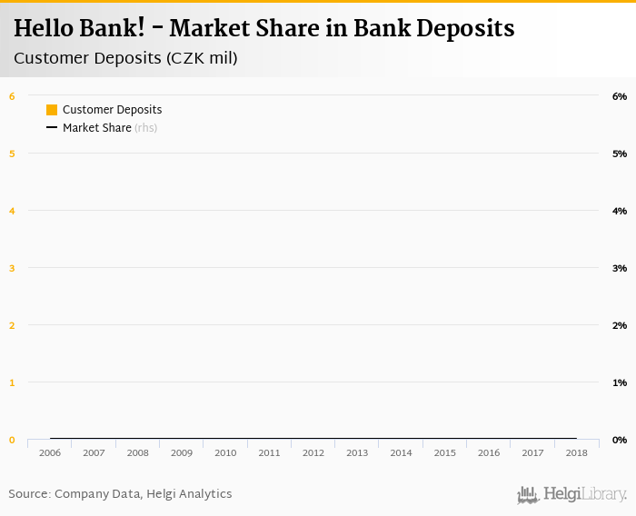 Hello Bank! accounted for 0% of all customer deposits taken by banks in Czechia at the end of 2018. Historically, the bank’s market share in customer deposits reached an all time high of 0% in 2018 and an all time low of 0% in 2006.