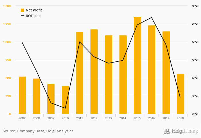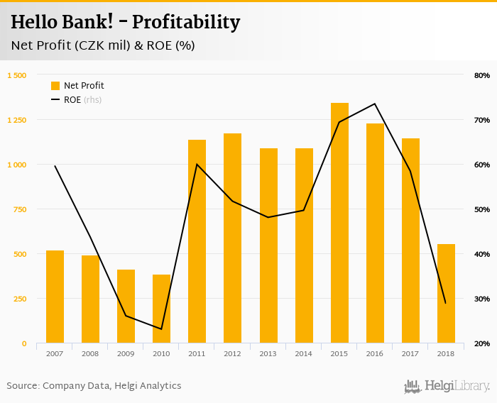 Hello Bank! made a net profit of CZK 554 mil in 2018, down 51.7% compared to the previous year. This implies a return on equity of 28.7%.