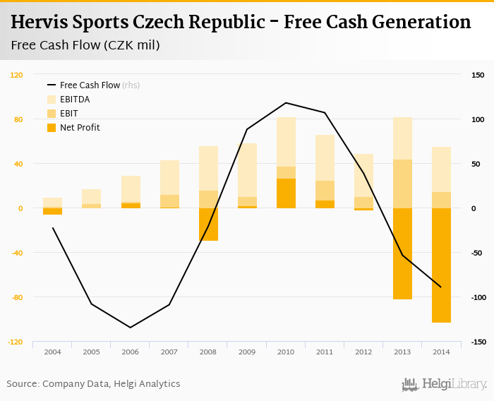 The company generated cash, defined by a sum of net profit and depreciation, of CZK -62.7 mil or -6.67% of sales. When investments are excluded, free cash flow reached CZK -89.9 mil, or -9.57% of sales in 2014.