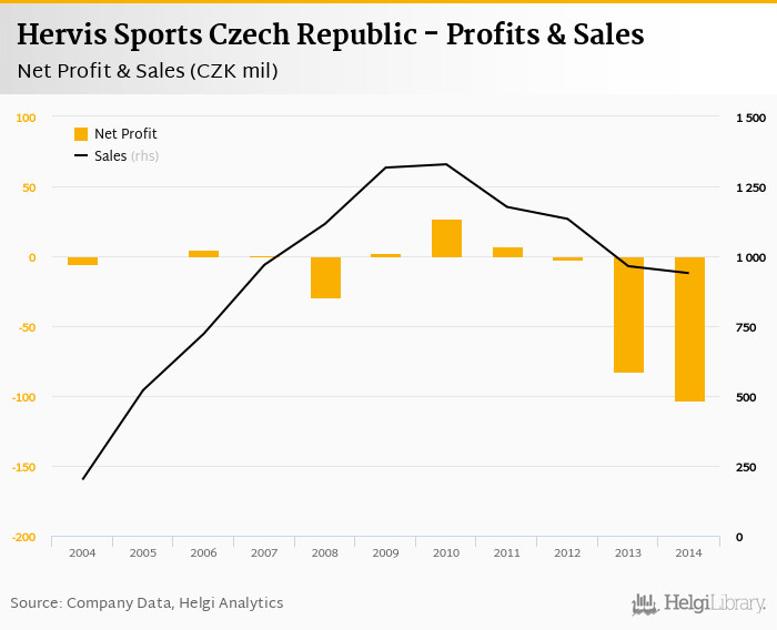 Hervis Sports Czech Republic made a net profit of CZK -103 mil in 2014, down 25.5% compared to the previous year. Total sales reached CZK 939 mil, which is down 2.58% when compared to the previous year.