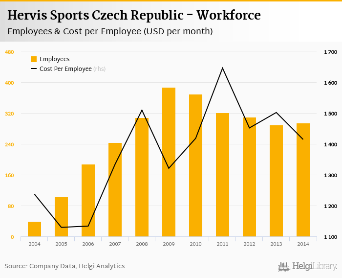 Hervis Sports Czech Republic employed 295 employees in 2014, up 2.08% compared to the previous year. Historically, between 2004 and 2014, the firm's workforce hit a high of 387 employees in 2009 and a low of 40.0 employees in 2004.