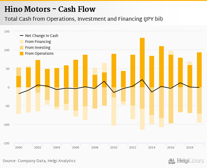 Hino Motors's operating cash flow stood at JPY 94.0 bil in 2019, up 57.5% when compared to the previous year. Historically, between 2000 - 2019, the firm’s operating cash flow reached a high of JPY 132 bil in 2013 and a low of JPY 30.5 bil in 2000.