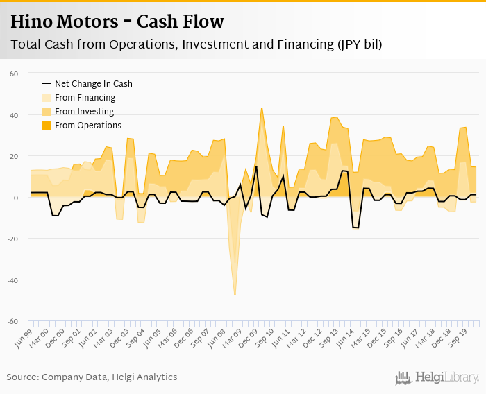 Hino Motors's operating cash flow stood at JPY 14.2 bil in 1Q2020, up 9.79% when compared to the previous year. Historically, between 2Q1999 - 1Q2020, the firm’s operating cash flow reached a high of JPY 43.1 bil in 1Q2010 and a low of JPY -32.0 bil in 4Q2008.