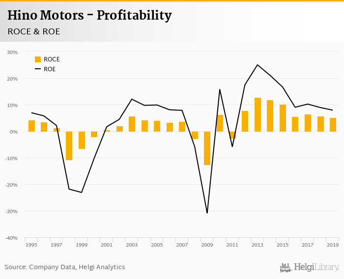As far as Hino Motors's peers are concerned, Toyota Motor Corporation generated ROE of 11.7% and ROCE of 5.77% in 2019. Mazda Motor Corporation's profitability reached 4.74% and 3.54%, respectively. Nissan Motor Company operated with 0.755% and 0.281% returns in 2019.
