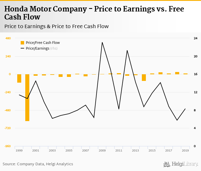 Regarding cash generated defined by the sum of net profit and depreciation, the stock traded at 4.21x at the end of 2019. When investments are excluded to get free cash flow, Honda Motor Company traded at 13.9x.