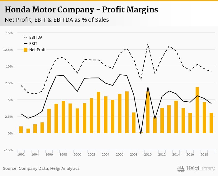 Honda Motor Company made a net profit of JPY 472 bil with revenues of JPY 15,522 bil in 2019, down by 35.4% and down by 1.47%, respectively, compared to the previous year.