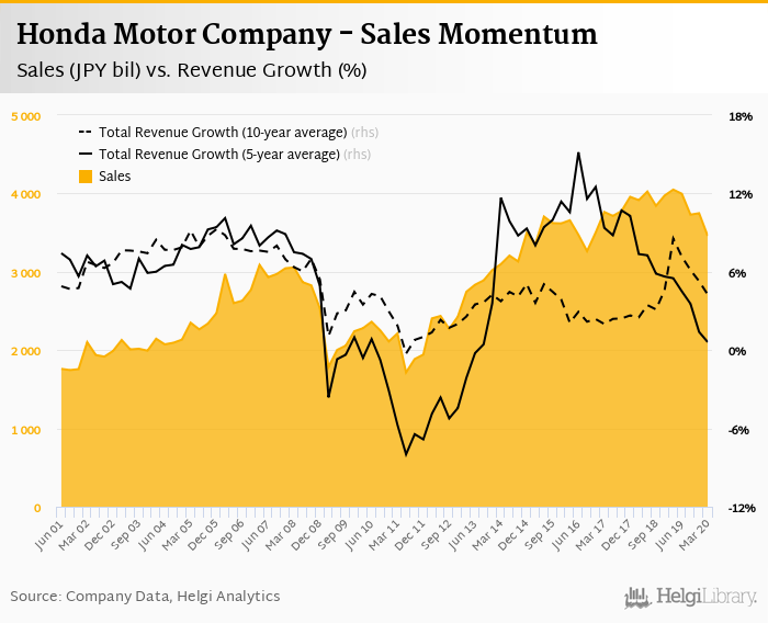 Honda Motor Company generated sales of JPY 3,458 bil in 1Q2020, down 14.6% compared to the previous year. Historically, between 2Q1991 and 1Q2020, the company’s sales reached a high of JPY 4,049 bil in 1Q2019 and a low of JPY 952 bil in 1Q1994.