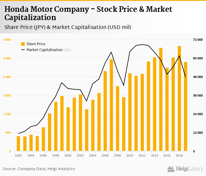Honda Motor Company stock traded at JPY 2,878 per share at the end 2019 implying a market capitalization of USD 47,575 mil.