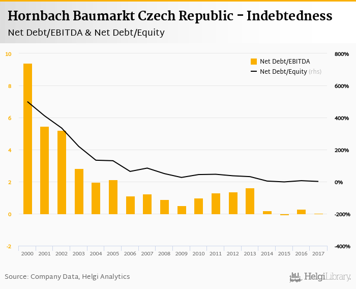 Hornbach Baumarkt Czech Republic's net debt stood at CZK 35.1 mil and accounted for 1.34% of equity at the end of 2017. The ratio is down 4.73 pp compared to the previous year.